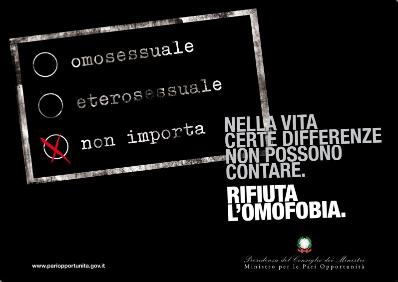 Per la prima volta in Italia, è stata realizzata dal Governo una campagna di sensibilizzazione contro l’omofobia e contro la violenza basata sulla discriminazione basata sull’orientamento sessuale.
