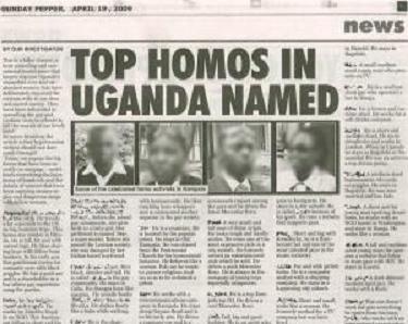 In Uganda il tabloid “The Red Pepper” ha pubblicato un intero articolo in prima pagina con i dati personali di persone che hanno finanziato, o continuano a finanziare le associazione omosessuali. Il giornale in questione, che già in passato aveva incitato al boicottaggio dei diritti omosessuali, ha pubblicato nome, cognome, indirizzo, ufficio, ed altri tipi di informazioni.