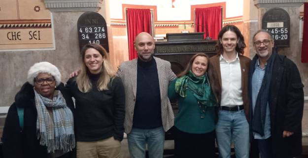 Nella foto da sinistra a destra: Eliad Dias Dos Santos (pastora metodista), Francesca Zoccali, Massimo Albano, Irene Grassi, Conner Drennen, Simone Caccamo (pastore battista)