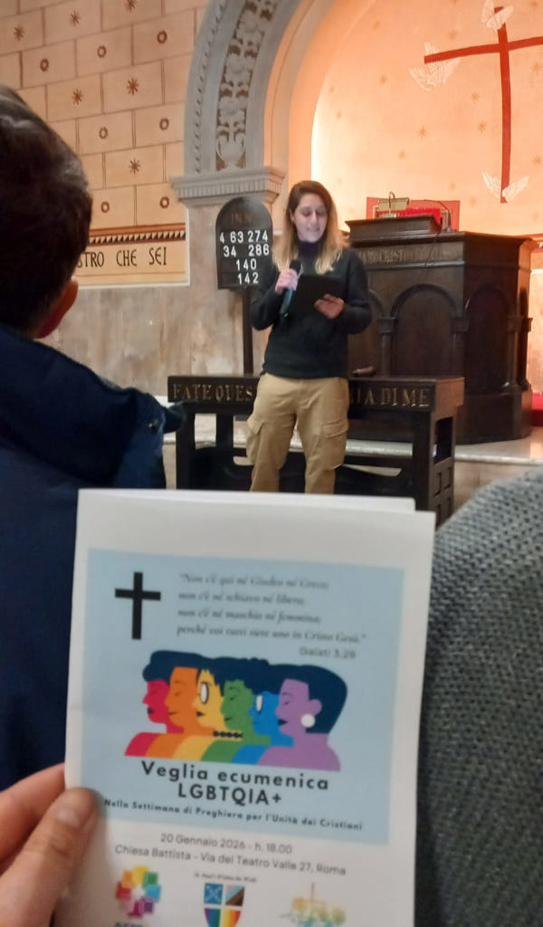 L’incontro è stato ospitato dalla chiesa battista di via del Teatro Valle e ha coinvolto credenti provenienti dal mondo cattolico (Associazione Ramo del Mandorlo), dalla chiesa episcopale anglicana (chiesa di St. Paul’s Within the Walls) e dalle chiese protestanti metodiste, valdesi e battiste (REFO+ gruppo di Roma). Alla preghiera hanno preso parte persone LGBTQ+ e altre e altri credenti, uniti dal desiderio di vivere un momento ecumenico senza rimuovere le differenze, ma attraversandole insieme.