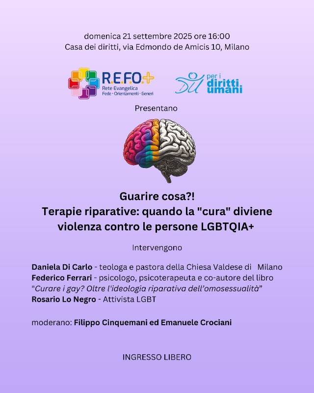 Domenica 21 settembre a Milano si è svolto un incontro organizzato dalla Rete evangelica fede, orientamenti generi (Refo+) e dall’associazione “Per i diritti umani” dedicato al tema delle pseudo-terapie riparative nei confronti dell’omosessualità. Tenutasi alla Casa dei diritti, sede laica, la tavola rotonda, moderata dai rappresentanti delle due associazioni Emanuele Crociani e Filippo Cinquemani, ha visto gli interventi di Federico Ferrari, psicoterapeuta esperto nel dare supporto psicologico a persone LGBTIAQ e co-autore del libro Curare i gay? Oltre l’ideologia ripartiva dell’omosessualità; e di Daniela Di Carlo, pastora della chiesa valdese di Milano valdese e teologa esperta in teologia queer, attualmente co-presidente della Commissione Fede Genere e Sessualità delle chiese battiste, metodiste e valdesi. Presente con una testimonianza anche Rosario, attivista cristiano LGBTQ.