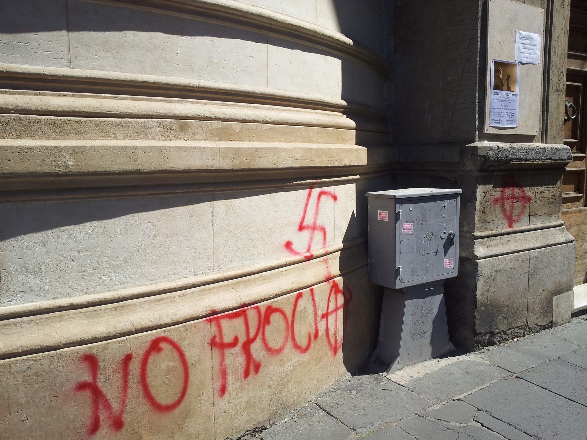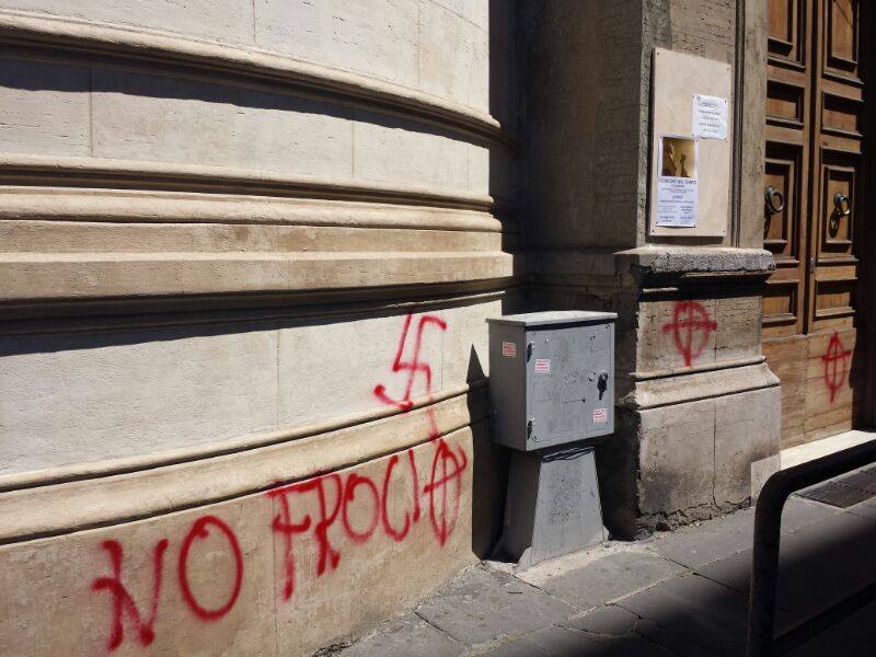 Sono state rilevati disegni di croci celtiche e svastiche oltre la scritta “No Froci” sui muri in via Marianna Dionigi, dove sono ubicati gli uffici della comunità ed è stata imbratta la facciata del Tempio con lancio di inchiostro nero nel tentativo di imbrattare la bandiera rainbow esposta in occasione della Giornata Mondiale di Lotta e di Contrasto all’Omofobia e alla Transfobia.